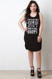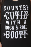 This plus size dress features a round neckline, sleeveless construction, graphic print which reads "COUNTRY CUTIE WITH A ROCK & ROLL BOOTY". Finished with ribbed knit fabrication and a curved hemline bodice. Accessories sold separately. 97% Rayon, 3% Spandex.
