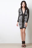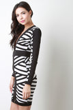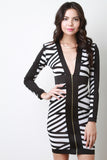 This bodycon dress features stripe print design, wide contrasting panel trimming, plunging v-neckline to a zipper fastener at front, long sleeves, and shoulder pad finish. Made in U.S.A. Accessories sold separately. 95% Polyester, 5% Spandex.