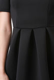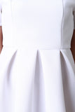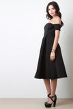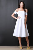 This midi dress features an off the shoulder neckline, short sleeves, high waisted cinched seam and finished with a skater flare skirt.Accessories sold separately. 95% Polyester, 5% Spandex.