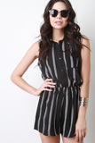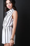 This button up romper features a classic shirt collar, elasticized waist,sleeveless and a single breast pocket. Finished with shorts bottom with lining, open back with single button closure design and vertical stripes designs. Accessories sold separately. Self: 100% Polyester Lining: 100% Polyester.