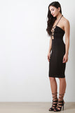 This bodycon dress features a self tie crisscross bodice design, a plunging neckline, sleeveless construction and finished with an open back. Accessories sold separately. Made in USA. 95% Polyester, 5% Spandex.