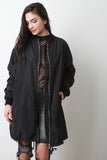 This bomber jacket features a longline construction, zipper front, drawstring hemline, ribbed knit collar, side pockets,, long sleeves with pen and zipper pocket, completed with lining. Accessories sold separately. 100% Polyester.