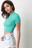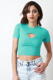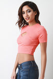 This crop top features soft rib knit, round neckline, keyhole cutout, and short sleeves. Accessories sold separately. Made in U.S.A. 48% Rayon, 48% Polyester, 4% Spandex.