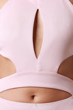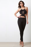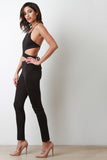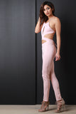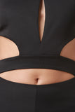This sexy jumpsuit features a keyhole cutout design on bust and additional cut outs on sides and midriff. Includes sculpture silhouette fit and taper cut legs. Finished with an open back self-tie lace closure. Accessories sold separately. Made in U.S.A. 96% Polyester, 4% Spandex.