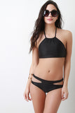This  bikini set  features halter style top with self-tie strings. Bikini bottom features side cut-outs and finished with lining. Accessories sold separately. Shell: 80% Nylon, 20% Spandex. Lining: 100% Polyester.