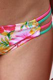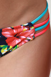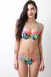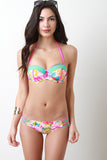This bikini set features colorful tropical floral pattern print, color block panel accent, structure foam molded padding, underwire, self-tie caged back strap, and removable adjustable halter strap. Matching bikini bottom features low rise, cheeky bottom with strappy caged sides. Accessories sold separately. 82% Polyamid, 18% Elastan. Lining: 100% Polyester.