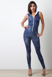 Denim Print Hooded Zip-Up Sleeveless Jumpsuit
