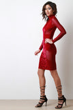 This midi dress features a semi-sheer fabrication with velvet filigree texture knit, long sleeves, mock neckline, and hidden zipper back. Made in U.S.A. Accessories sold separately. 96% Polyester, 4% Spandex.