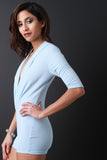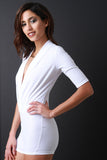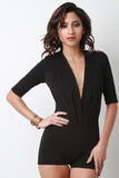 This fitted romper features a textured fabrication, plunging v-neckline, short sleeves, and shorts bottom half. Accessories sold separately. Made in U.S.A. 95% Polyester, 5% Spandex.