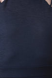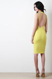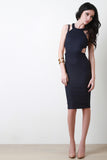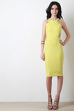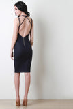 This edgy midi dress features a high-neck halter top with double button closure at nape, sleeveless construction, strappy open back design, and exposed back-zip closure. Partially lined. Accessories sold separately. Made in U.S.A. 95% Polyester, 5% Spandex.