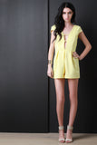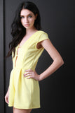This cute romper features a strappy deep-v neckline, cap sleeves design, pleats detail, back zip closure, and finished with gentle flare legs. Partially lined. Accessories sold separately. Made in U.S.A. 96% Polyester, 4% Spandex.