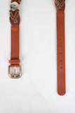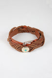 This trendy western style belt features strappy knotted cords, contrast vegan leather, embossed gold-tone conchos with turquoise stone accents, and adjustable closure.