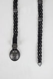This ultra stylish belt features braided vegan leather, small embossed concho discs, and adjustable closure.