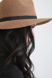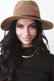 This panama style hat features straw-like fabric, wide brim, and single ribbon band.