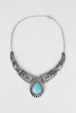 This lovely necklace features delicate chain link, hinged embossed tribal panels, teardrop shaped turquoise stone pendant, and adjustable lobster hook closure. Finished with matching turquoise dangle earrings.
