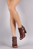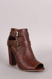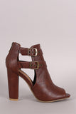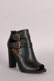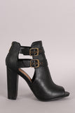 These stylish  booties  feature a peep toe silhouette, side cutout designs, double straps with two buckle accents, and chunky wrapped heel. Finished with cushioned insole  and convenient back-zip closure.