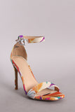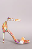 This vintage-chic heel features a colorful leaf print fabric, square toe, basic duo strap, open-toe silhoutte, single sole, and wrapped stiletto heel. Finished with lightly padded insole and adjustable ankle strap with buckle fastening.