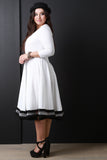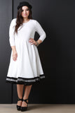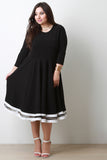 This plus size midi dress features a round neckline, three quarter sleeves and high waisted cinched seam. Finished with a skater flare skirt and a stripe trimming design. Accessories sold separately. 95% Polyester, 5% Spandex.