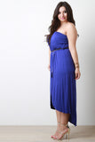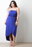This cute plus size maxi dress features a jersey knit fabrication, strapless and a ruched elasticized tube neckline. Finished with an adjustable chain belt with a tassel and an asymmetrical hemline. Accessories sold separately. 97% Rayon, 3% Spandex.