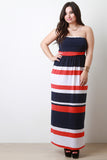 This plus size maxi dress features a stripe design fabrication throughout, strapless and a ruched elasticized tube neckline. Finished with a cinched waist. Accessories sold separately. 90% Polyester, 10% Spandex.