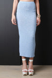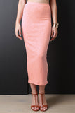 This maxi skirt features a hidden elasticized waistband, ribbed knit fabrication, stretchy fit and maxi-length hem. Accessories sold separately. Made in U.S.A. 95% Polyester, 5% Spandex.
