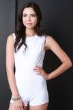 This fitted romper features a round neckline, sleeveless construction with shoulder padding, and shorts bottom half. Finished with a cage back design and a zipper fastener at back. Accessories sold separately. Made in U.S.A. 67% Viscos, 28% Nylon, 5% Spandex.