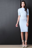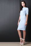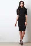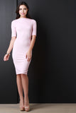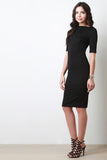 This bodycon bodice with a wide neckline, quarter sleeves, and a midway adjustable back zipper. Jacquard texture throughout. Finished with a back slit. Accessories sold separately. Made in U.S.A. 97% Polyester. 3% Spandex.
