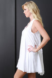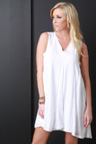 This sleeveless dress features a v-neckline, flowy shift cut fit, trapeze flare seam, and lined underlay. Accessories sold separately. 100% Rayon. Lining: 100% Polyester.