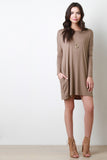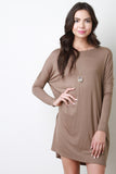 This jersey knit shift dress features a round neckline, long dolman sleeves, and hidden side pockets. Accessories sold separately. Made in U.S.A. 95% Rayon, 5% Spandex.