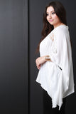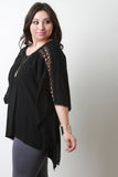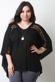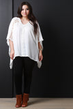 This plus size top features a v-neckline, semi-sheer fabrication, poncho sleeve, and crochet lace detail. Accessories sold separately. 100% Rayon.