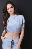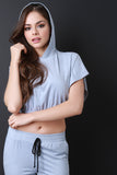 This  crop top  features a soft vegan suede fabrication, cap sleeves, hooded neckline, and elasticized cropped hemline. Accessories sold separately. Made in U.S.A. 95% Polyester, 5% Spandex.