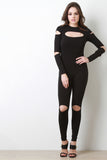 This sexy jumpsuit features smooth stretch knit, round neckline, cut out design, keyhole front,  back zipper closure, and taper cut legs. Accessories sold separately. Made in U.S.A. 92% Cotton 8% Spandex