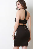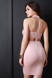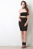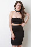 This bodycon dress features a bandeau style front, high waist knee length skirt, choker neck, exposed zipper closure, knit fabrication. Accessories sold separately. Made in U.S.A 96% Polyester, 4% Spandex.
