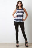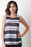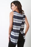 This stripe knit fabrication, round neckline, tulip open back design, and a high low hemline. Accessories sold separately. Made in U.S.A. 57.5% Rayon, 42.5% Polyester.