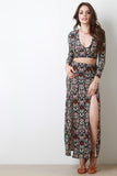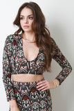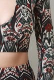 This abstract print knit fabrication, deep-v neckline, and cropped elasticized hemline. Accessories sold separately. Made in U.S.A. 96% Polyester, 4% Spandex.