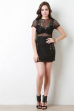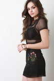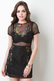 This dress features a mesh fabrication throught, colorful floral applique design, round neckline, and short sleeves construction. Finished with a faux satin skirt underlay, and hidden back zip-up closure.