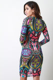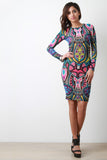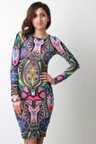 This vibrant dress features a multi color tribal print throughout, a round neckline, and long sleeves. Finished with a sculpture fit and midi length hemline. Accessories sold separately. Made in U.S.A. 100% Polyester.