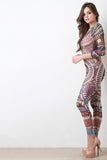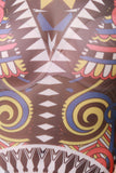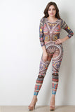 This semi-sheer tribal print throughout, a round neckline, and keyhole back with button closure. Finished with long sleeves and fitted legs. Undergarments not included. Accessories sold separately. Made in U.S.A. 100% Polyester.