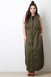 This plus size dress is maxi length and sleeveless design. It is full button up closure with a working drawstring waist and two working front pockets. Finished with two side slits. Accessories sold separately. 100% Rayon.