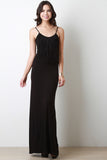 This jersey knit dress features a round neckline with swingy long fringe detail, sleeveless design, spaghetti shoulder straps, and maxi-length hemline. Accessories sold separately. Made in U.S.A. 96% Rayon, 4% Spandex.