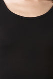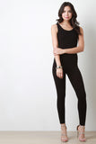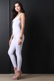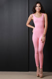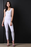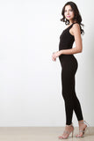 This casual jumpsuit features a smooth stretch knit fabrication, scoop neckline, and sleeveless construction. Accessories sold separately. Made in U.S.A. 95% Cotton, 5% Spandex.