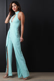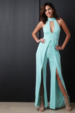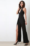 This jumpsuit features wide cut legs with vent slit constructed front, high waisted cinched seam, large keyhole cutout yoke to a wide choker neckline to a self-tie bow at nape, and open back. Accessories sold separately. Made in U.S.A. 95% Polyester, 5% Spandex.