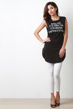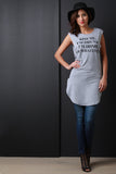 This top features a jersey knit fabrication, round neckline, sleeveless construction with dropped arm holes, and a round hemline. Finished with a print that reads, "KISS ME, I'M DRUNK,I'M IRISH, OR WHATEVER." Accessories sold separately. Made in U.S.A. 96% Polyester, 4% Spandex.