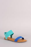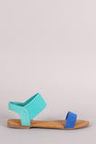 This chic sandal features a vegan suede upper with elasticized front strap, two-tone color, slingback construction, and open toe silhouette. Finished with a lightly padded insole.