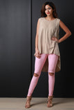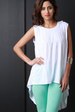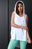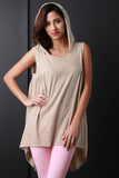 This hooded top features jersey knit fabrication, a round neckline, sleeveless construction, seams at the bodice and finished with a high low hemline. Accessories sold separately. Made in U.S.A. 100% Cotton.