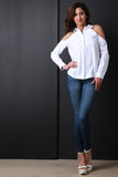 This shirt features a classic shirt collar, cold shoulder long sleeves construction with double button cuffs and button-up front. Finished with a round hemline. Accessories sold separately. 100% Cotton.