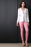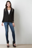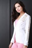 This edgy blazer features a peak lapel collar, hook an eye single front closure, metal grommet details on front and sleeves, a double vent in the back and faux pockets. Accessories sold separately. 96% Polyester 4% Spandex