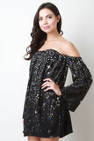 This shift dress features an off the shoulder neckline with boning, smooth fabrication with galaxy night theme print, long bell sleeves and finished with a back hidden zipper closure. Accessories sold separately. Shell 1: 100% Polyester, Shell 2: 74% Polyester, 24% Rayon, 2% Spandex.