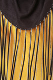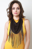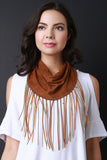 This unique  scarf  features vegan suede, alternating chain and suede fringe, and self-tie back.