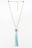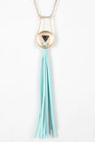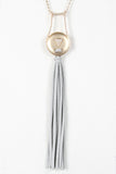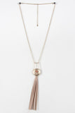 This  necklace  features delicate chain, matte metallic disc with protruding stone, vegan suede fringe tassel, and adjustable lobster hook closure.